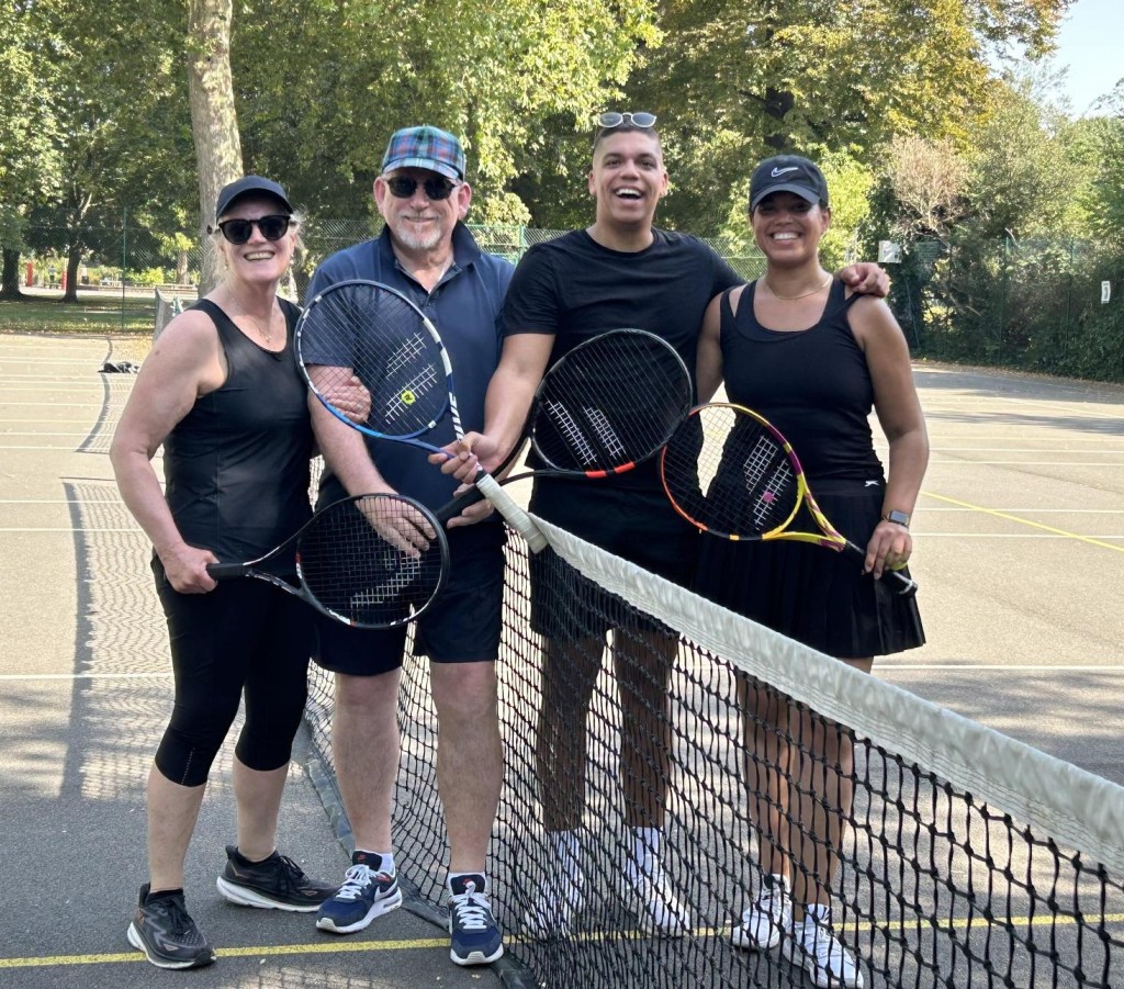 Now, who would be my partner ? Kirsty had a bit of a hit up and it became clear that Kate and Maggie were not moving from their picnic blanket in the shade. So, Kirsty it was, and didn’t she perform well. It must be 20 years since she set foot on a court, and her form was great. As she said, “body memory “.