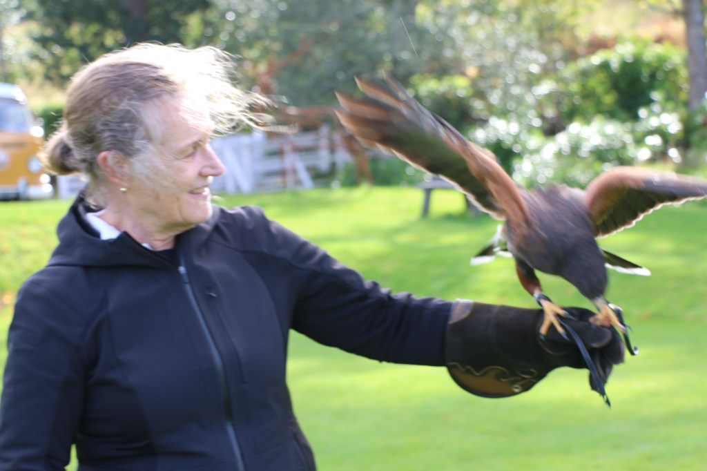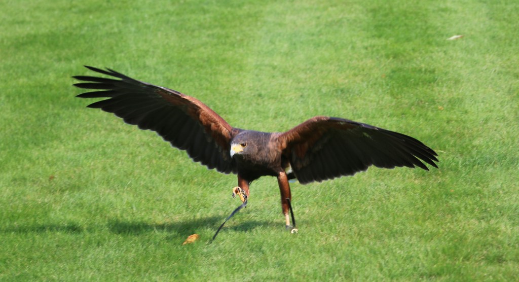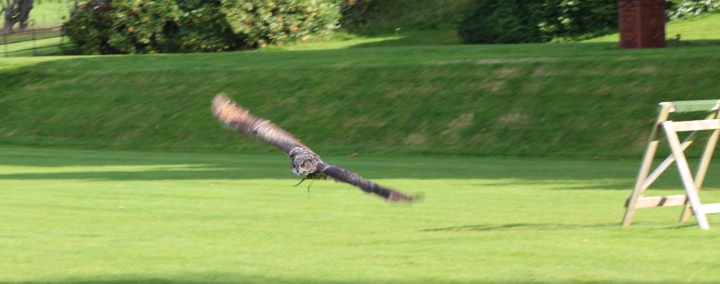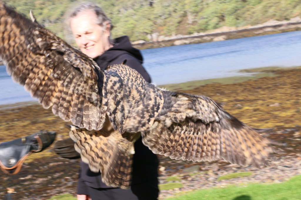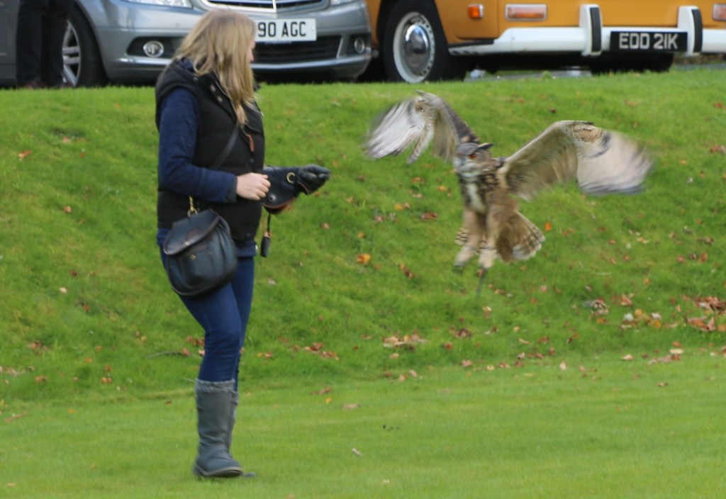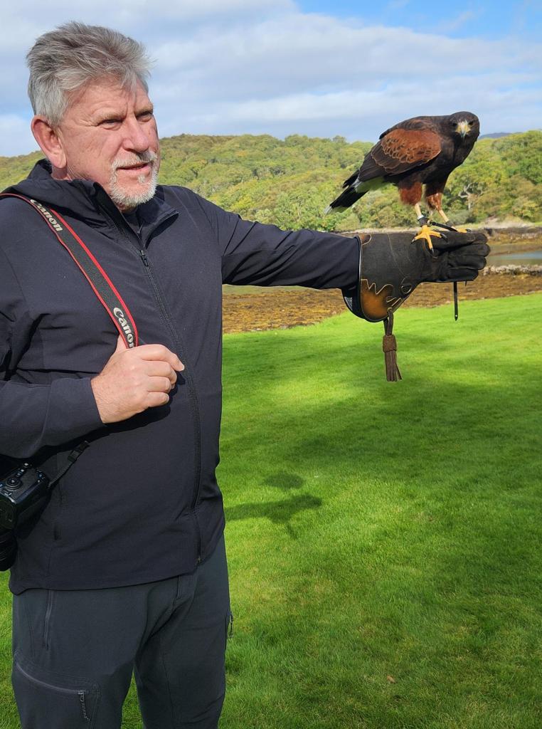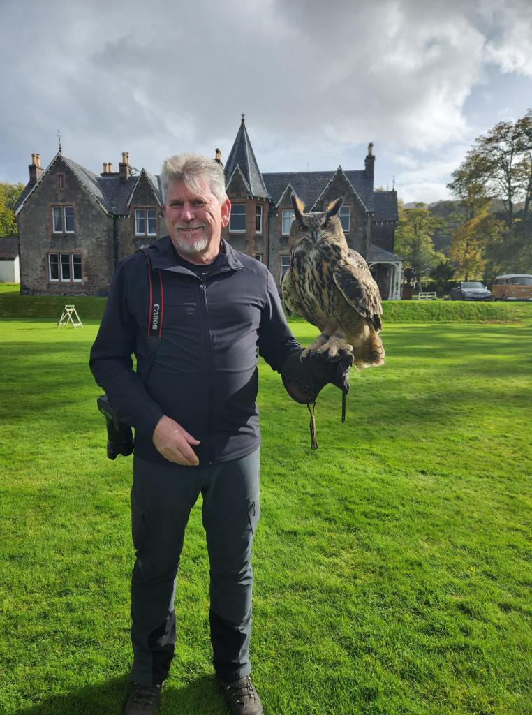 Anyway, we were here for the birds. A Falconery exhibition. There was the delightful Falconer and only us. We had over an hour on the front lawn of the hotel, beside the Loch, flying firstly a Harris Hawk called “Bennie” and then a Great Horned Owl called “Flash”. It was great fun and we both got to have the birds come to us to be fed on numerous occasions. The information about them was fascinating and informative. You quickly changed your view of these hunting machines from mean looking predators to soft, gentle souls, just looking for an easy feed.