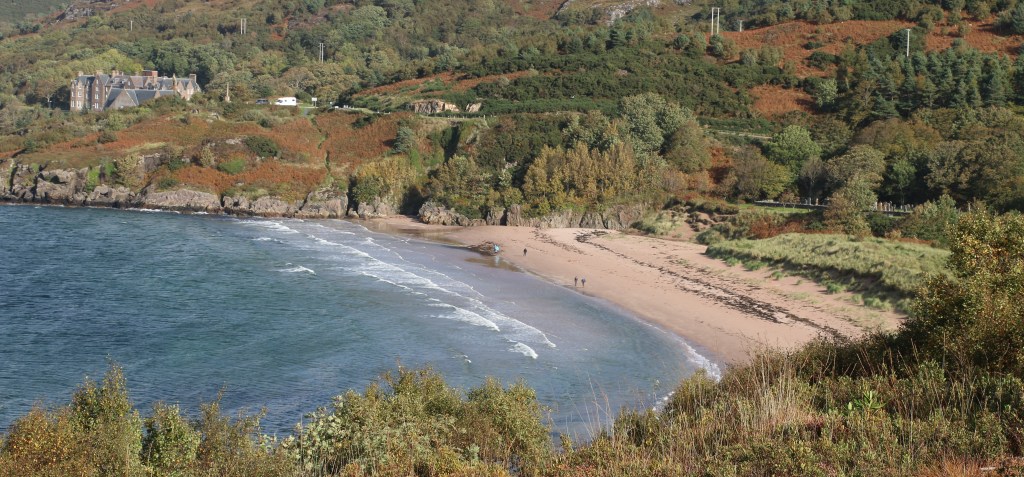 The road was then a lane each way, luxury ! When we arrived at Gairloch it was closed. They must work to Aussie holidays. To be fair, we arrived at the docks and given the wild weather, no wonder no-one was about. We decided a walk would clear our heads and we followed a sign that said “Beach 1 km”. As the path kept climbing we were perplexed as in our experience beaches are usually at sea level. It eventually emerged, we were on top of a headland looking down on a beach. We could see a carpark next to the beach. The next step was an easy decision, back track and drive.