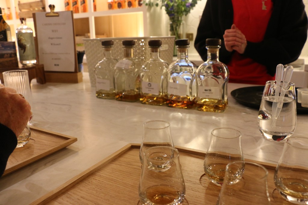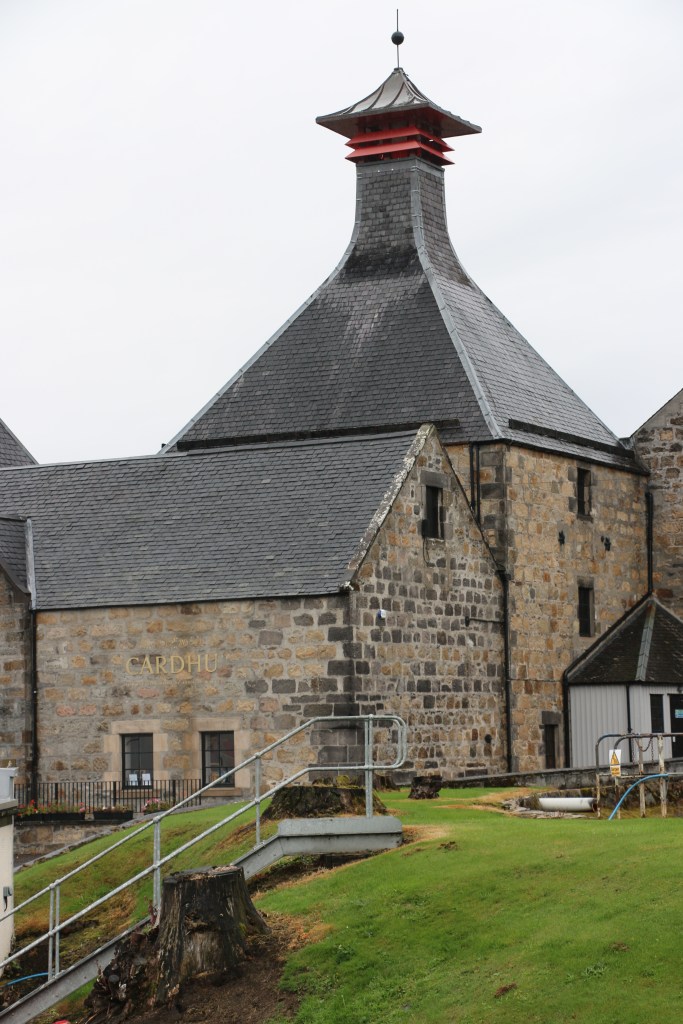 Our first appointment was at Cardhu for a whisky “Experience”. This did not involve a distillery tour but a chance to taste 5 different single malts from 5 of their local distilleries. Each malt was barrel strength and we got to draw the samples direct from the barrels, and very generous samples they were to !