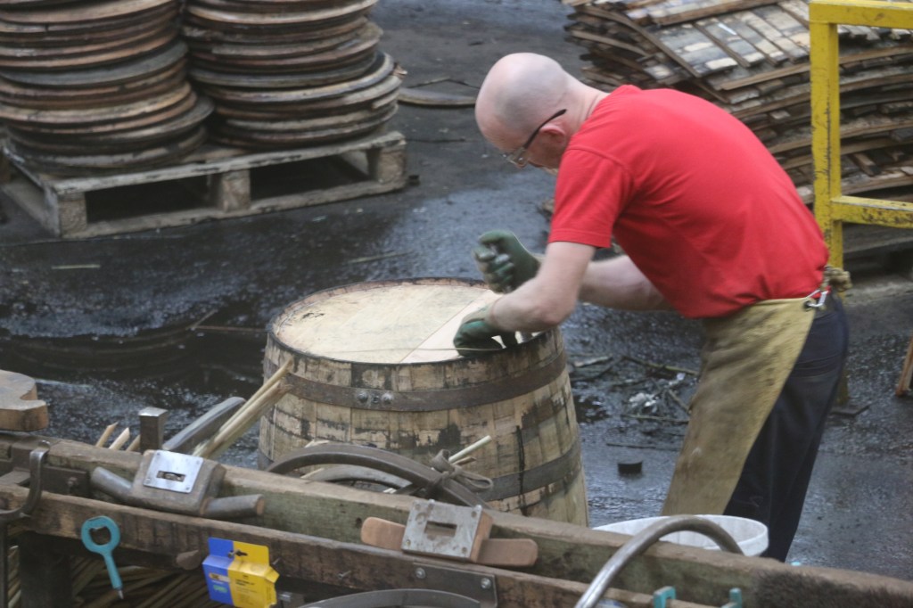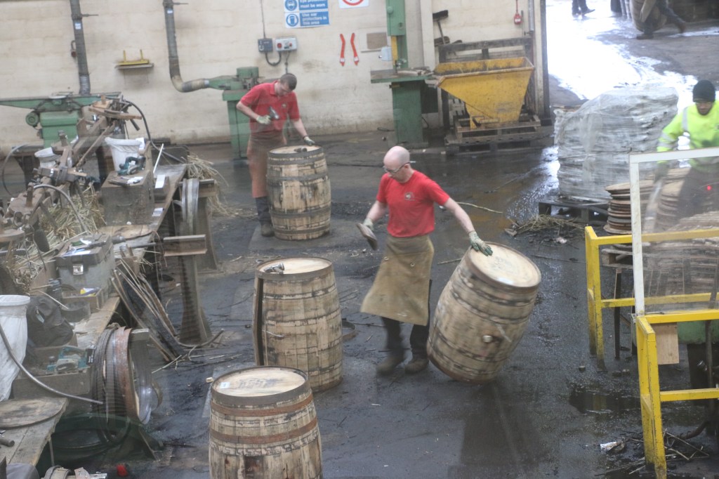 Our next appointment was at the Speyside Cooperage. It makes, but mainly restores, the whisky barrels for not only Speyside, but just about everywhere. Our guide explained the whole process, which basically boils down to the fact that if it wasn’t for their magnificant barrels the Whisky would be crap. It’s all about the barrel…..and you can see his point. There was a viewing platform where we could see the Coopers at work. They are paid per completed barrel. Today they were restoring ex-bourbon barrels. It is noisy and dirty work. They wouldn’t disclose how much they get per barrel, but he did say to have a look at the staff car park and we would see that they are doing quite well.